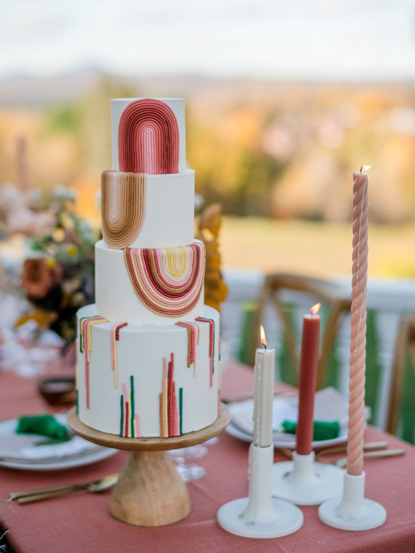 A macrame-inspired cake with earthy jewel tones is amazing for any boho couple. This one has architectural swopping curves and bold lines that look amazing against a stark white cake. A real must for anyone who loves creative, statement finishes.